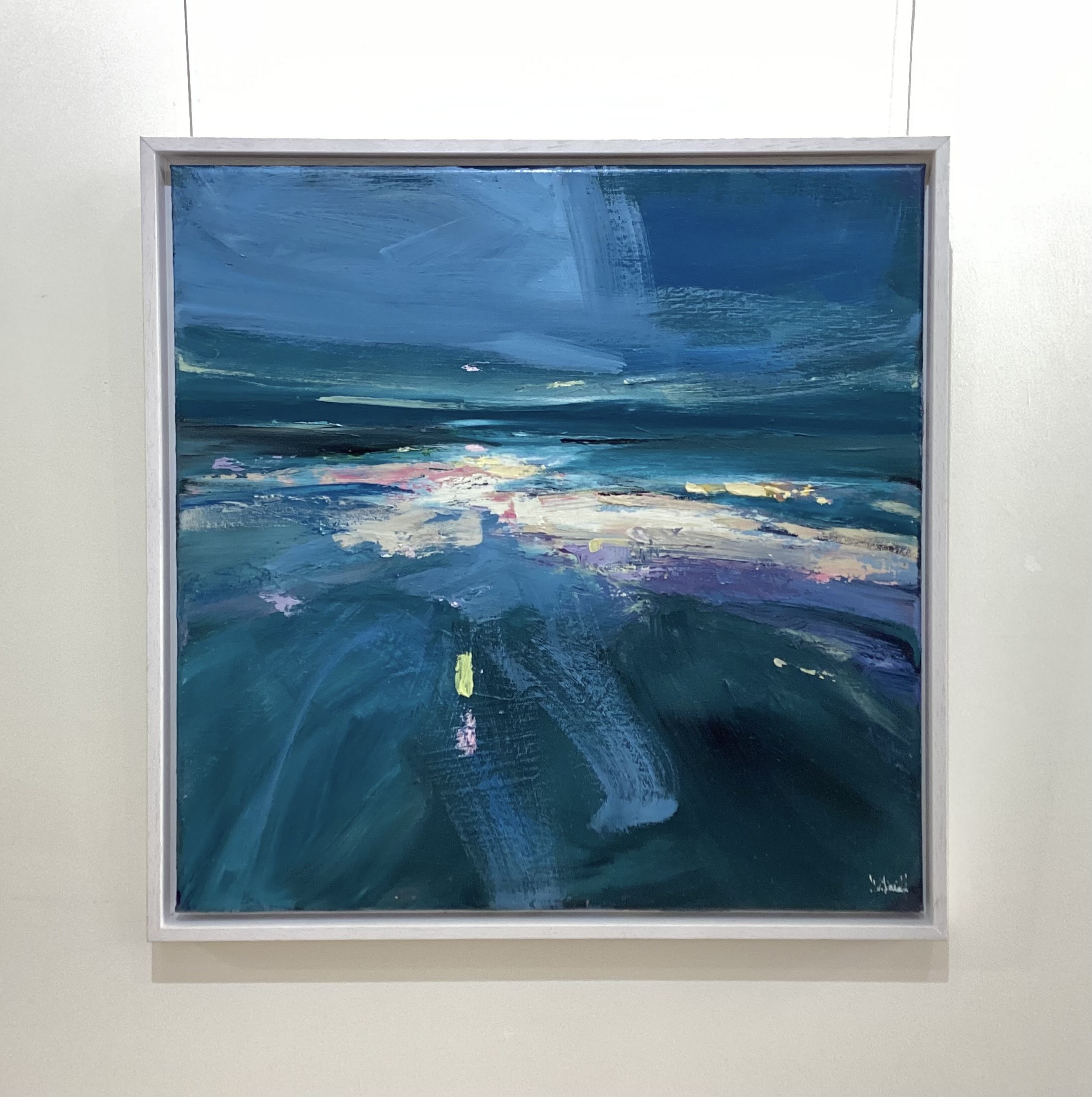 An atmospheric oil study of Scotland’s west coast at dusk: the setting sun slips beneath a horizon where land meets sky, leaving deep blues dominating the scene. Fading light glimmers in gentle whites and warm traces, capturing the quiet stillness of an evening almost lost to night.