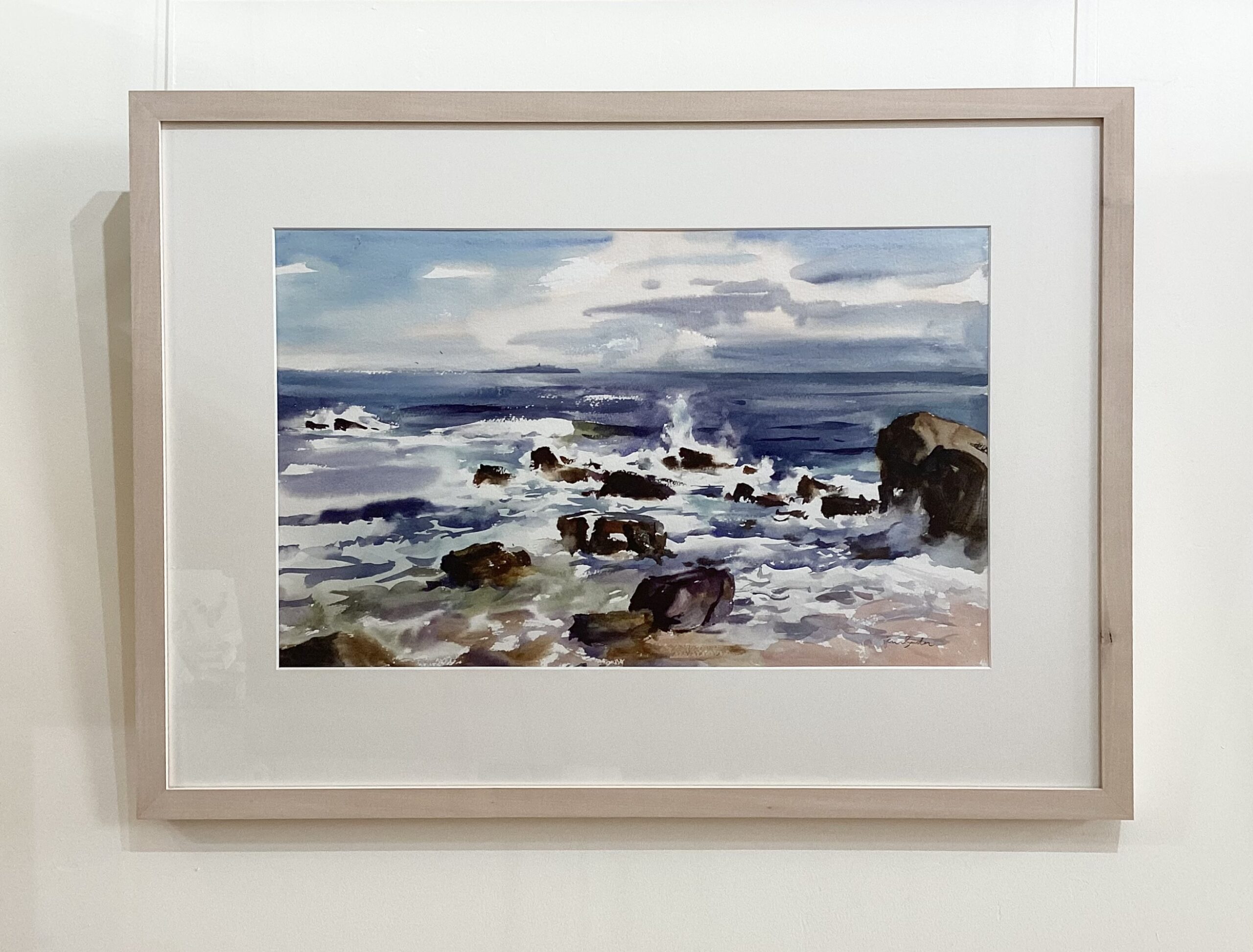 In Jem Bowden’s watercolour, the Isle of May emerges faintly on the horizon, surrounded by the vast North Sea. Rolling waves crash against the rugged rocky shoreline of the East Neuk of Fife, their foamy crests reflecting shades of blue and green. The soft interplay of light and water evokes a tranquil yet dynamic coastal scene, inviting viewers into its serene beauty.