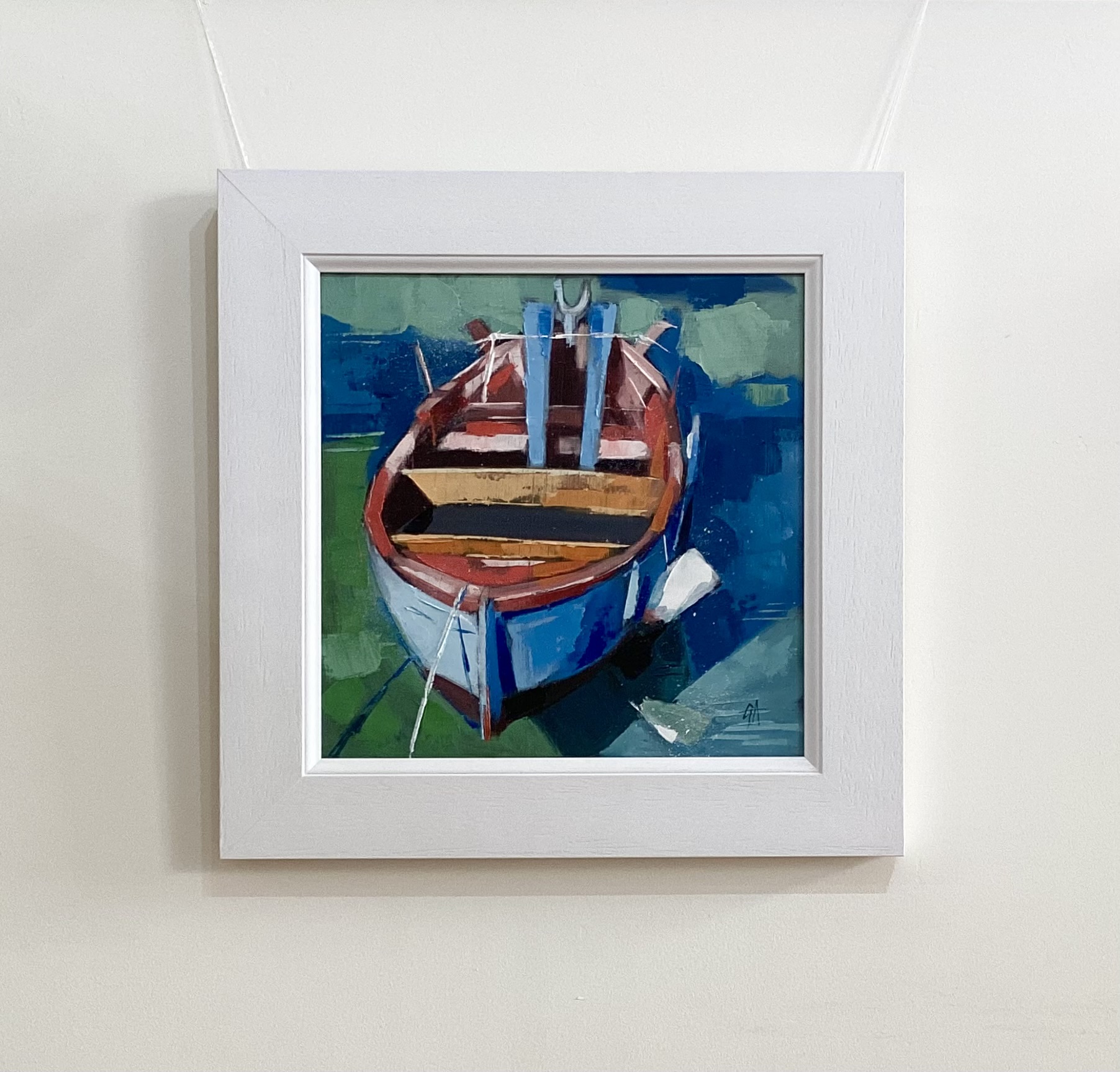 Gwen Adair’s oil painting captures a traditional skiff moored on the wet sands of the Solway Firth. The pale blue hull gleams alongside the rich oak gunwales, reflecting the sunlight after the tide recedes, showcasing a vibrant harmony of colours against the tranquil coastal backdrop.