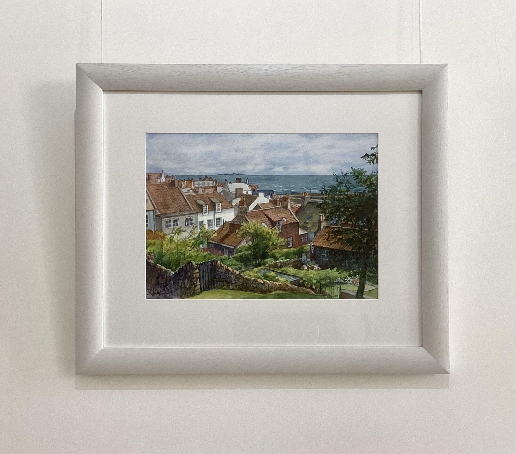 A watercolour by Jan Fisher depicts the sunlit fishing village of St. Monans, Fife. In the foreground, stone-walled gardens glow in warm light. Behind, vibrant red-tiled rooftops cascade down the hillside. On the horizon, the Isle of May stands silhouetted against a soft, luminous sky, capturing the tranquil charm and scenic beauty of this coastal haven.