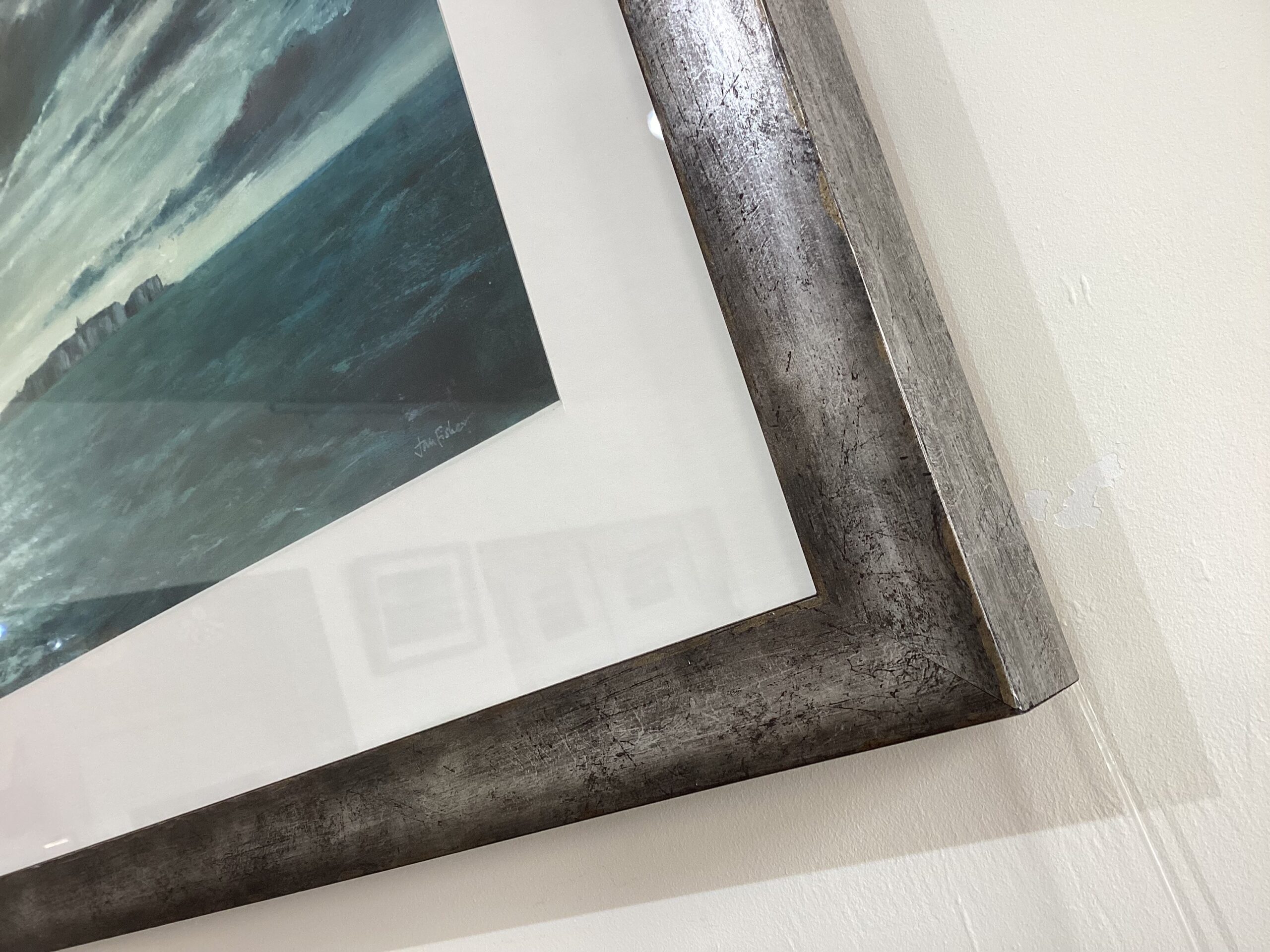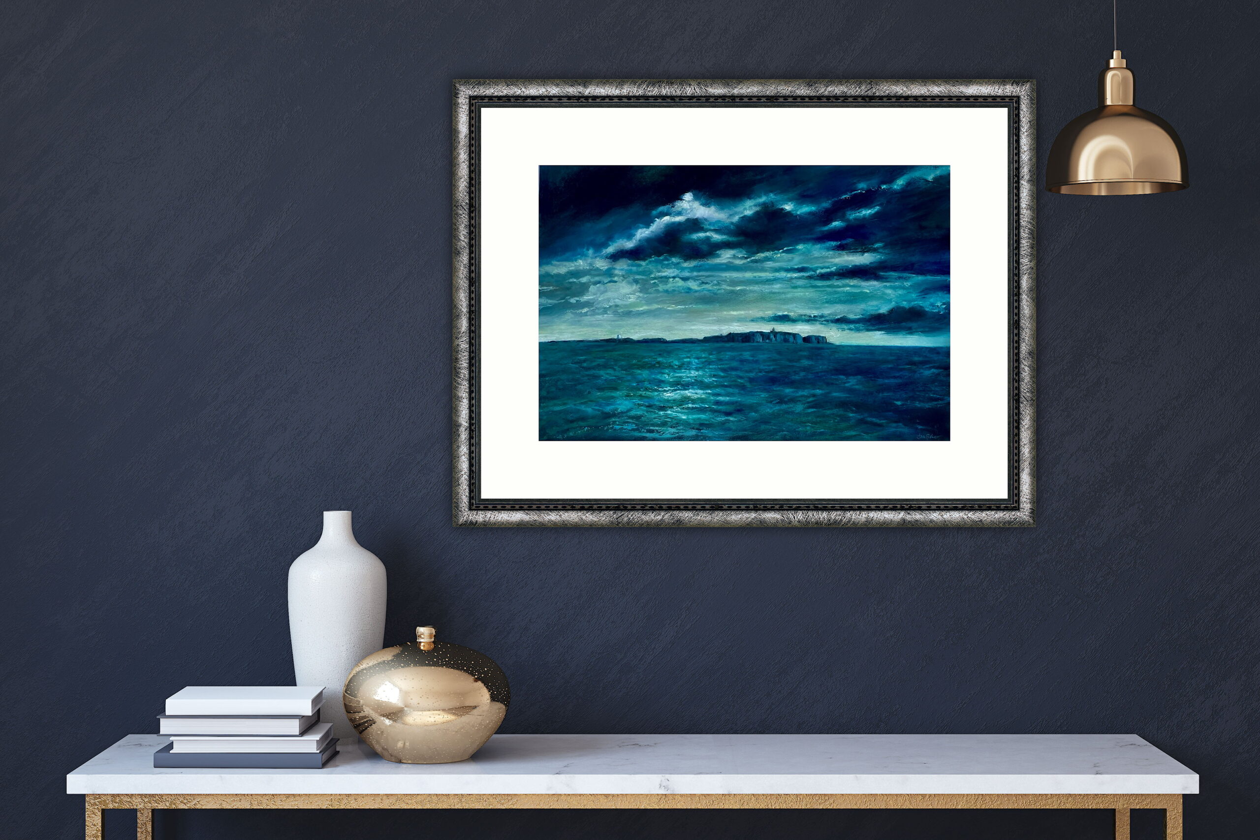 Jan Fisher’s oil painting depicts the Isle of May under a moody moonlit sky, with dark storm clouds swirling overhead. The faint moonlight breaks through, casting silvery reflections on turbulent waters, creating a dramatic, atmospheric scene full of tension and mystery.