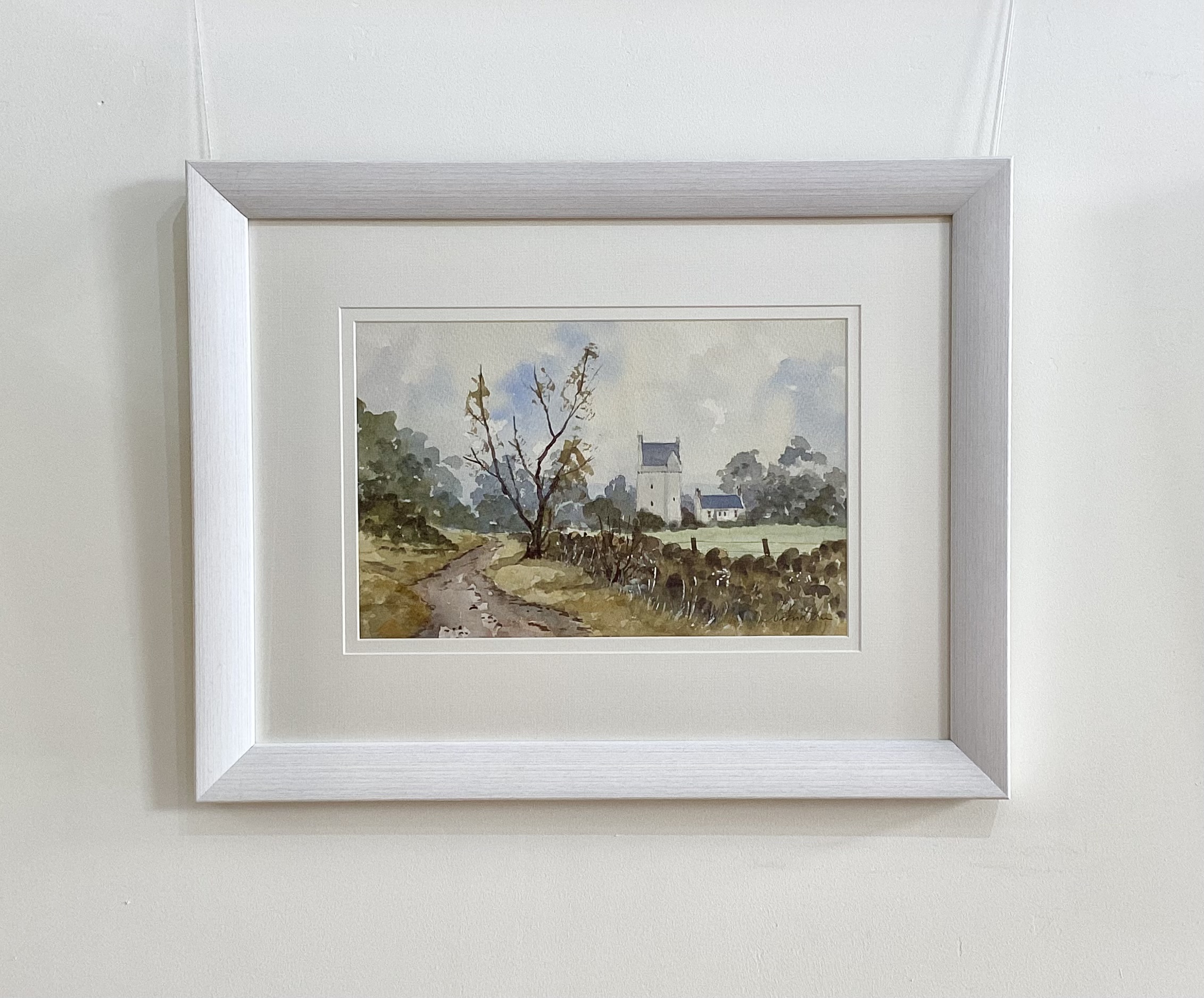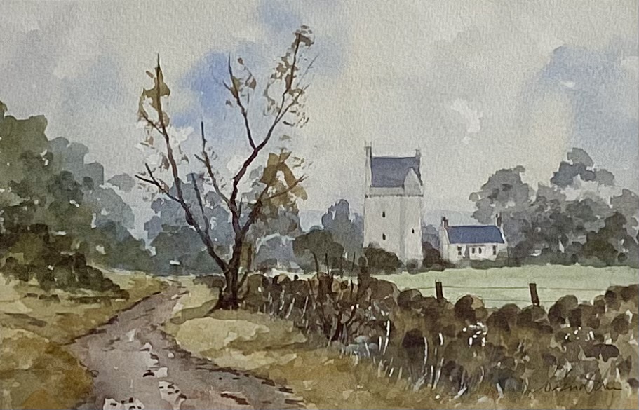 In this captivating watercolour by John Davie, the 15th-century Scottish Towerhouse owned by the Scott family rises majestically against a dramatic stormy sky. The tower dominates the skyline near Hill of Tarvit and Cupar, with a winding pathway bordered by a sturdy stone dyke wall, inviting viewers to journey toward its storied entrance.