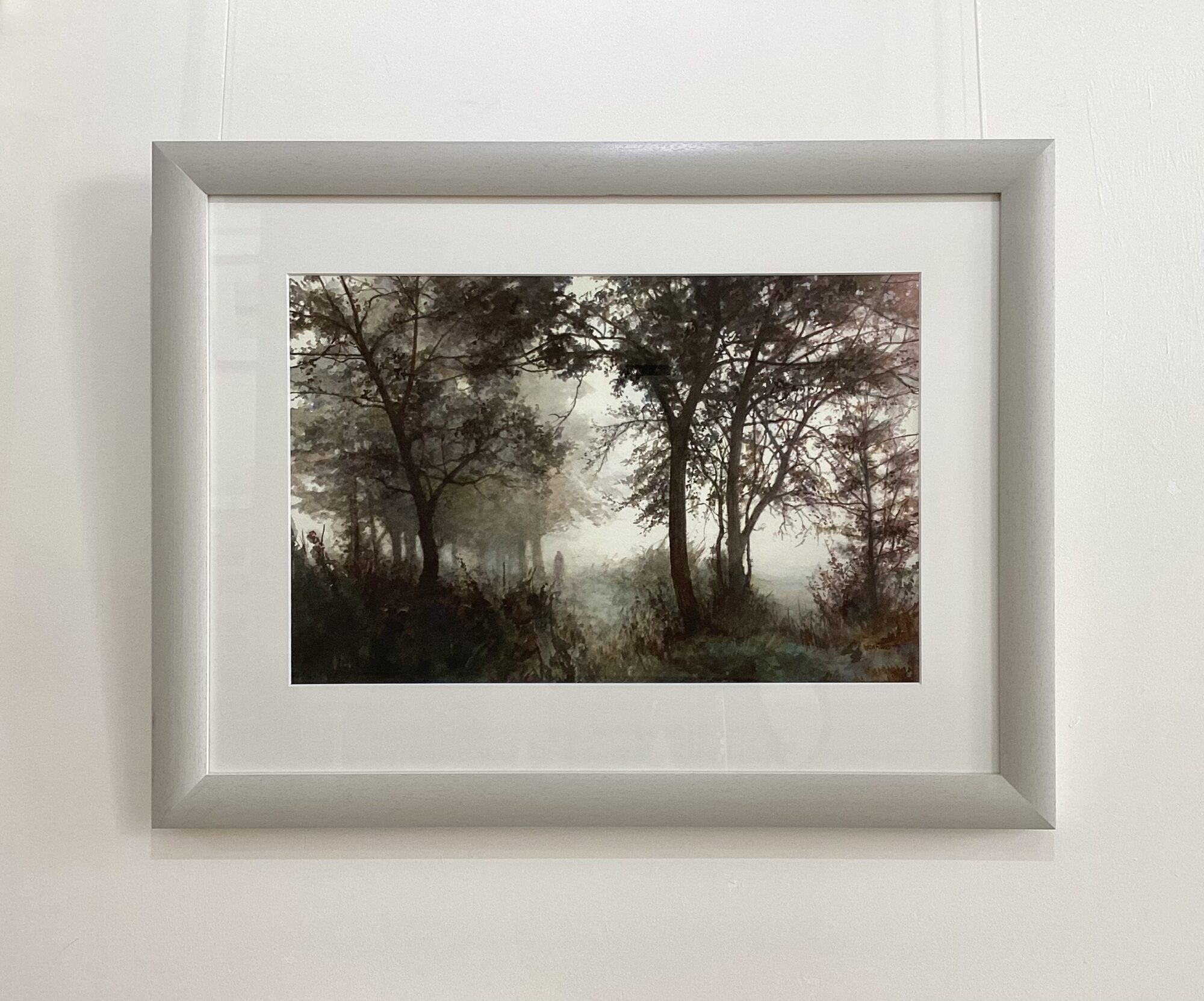 Jan Fisher’s watercolour portrays a tranquil Perthshire woodland in the morning. Densely packed ancient trees are illuminated by shards of sunlight filtering through the canopy, casting dappled light on the lush forest floor, evoking a sense of peaceful serenity and natural timelessness.