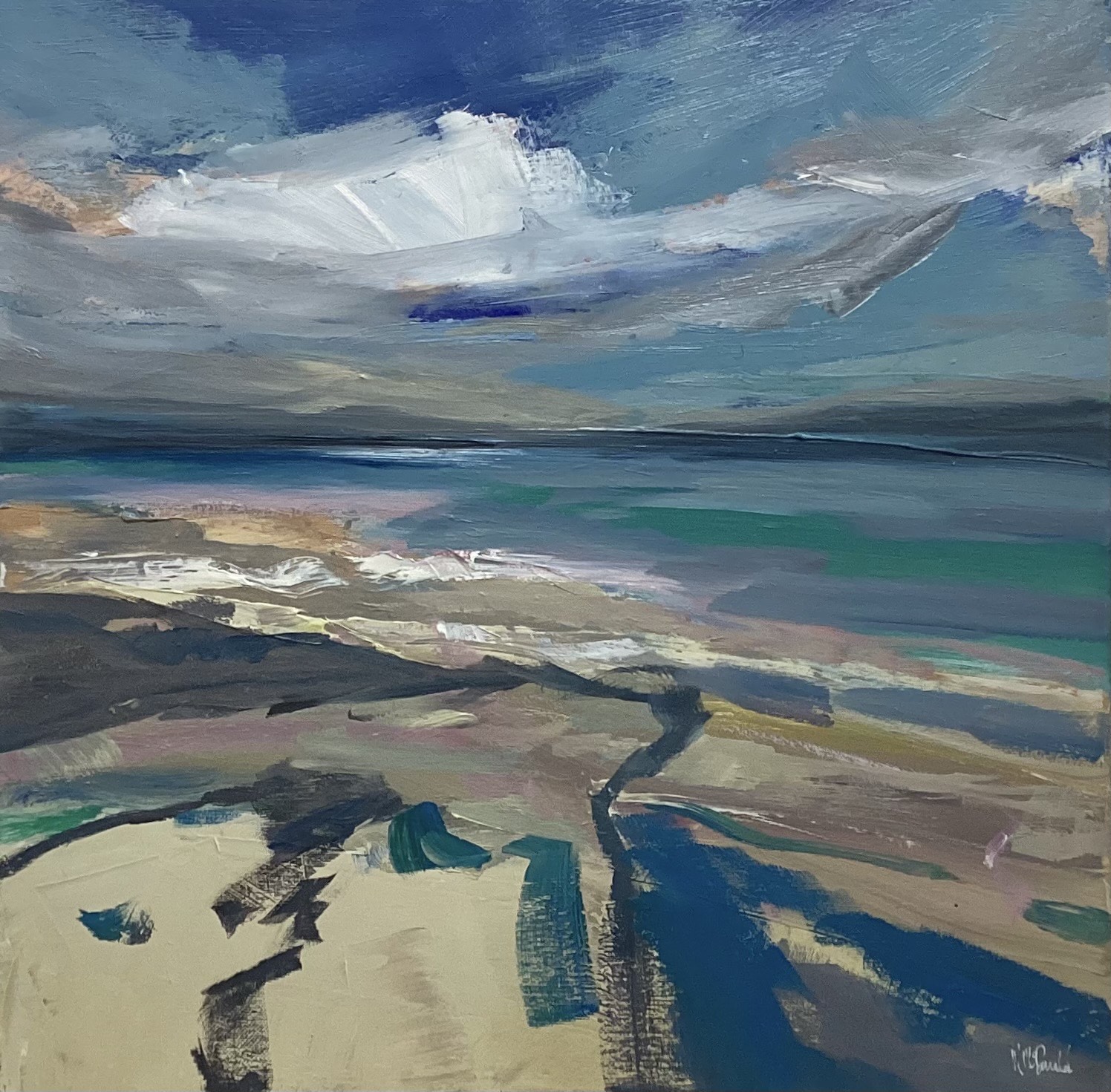 Mary McDonald’s oil painting captures a white-sand Hebridean beach under ferocious gale-force winds. The sea churns in streaks of turquoise and steel, meeting a sweeping expanse of rugged land. Above, white clouds race across the sky, rendered in swift, energetic brushstrokes that mirror their incredible speed. The whole vista feels alive and untamed, as though the wind itself could lift you from the shore.